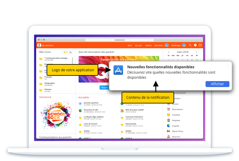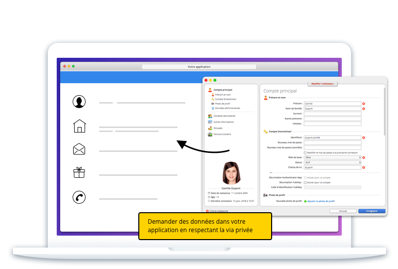 Votre application utilise-t-elle d’autres identifiants et mots de passe? Encore un mot de passe que les élèves doivent retenir? Facilitez la connexion en utilisant Smartschool. Après la connexion, des données du profil comme le nom et le prénom peuvent être demandées dans votre application.