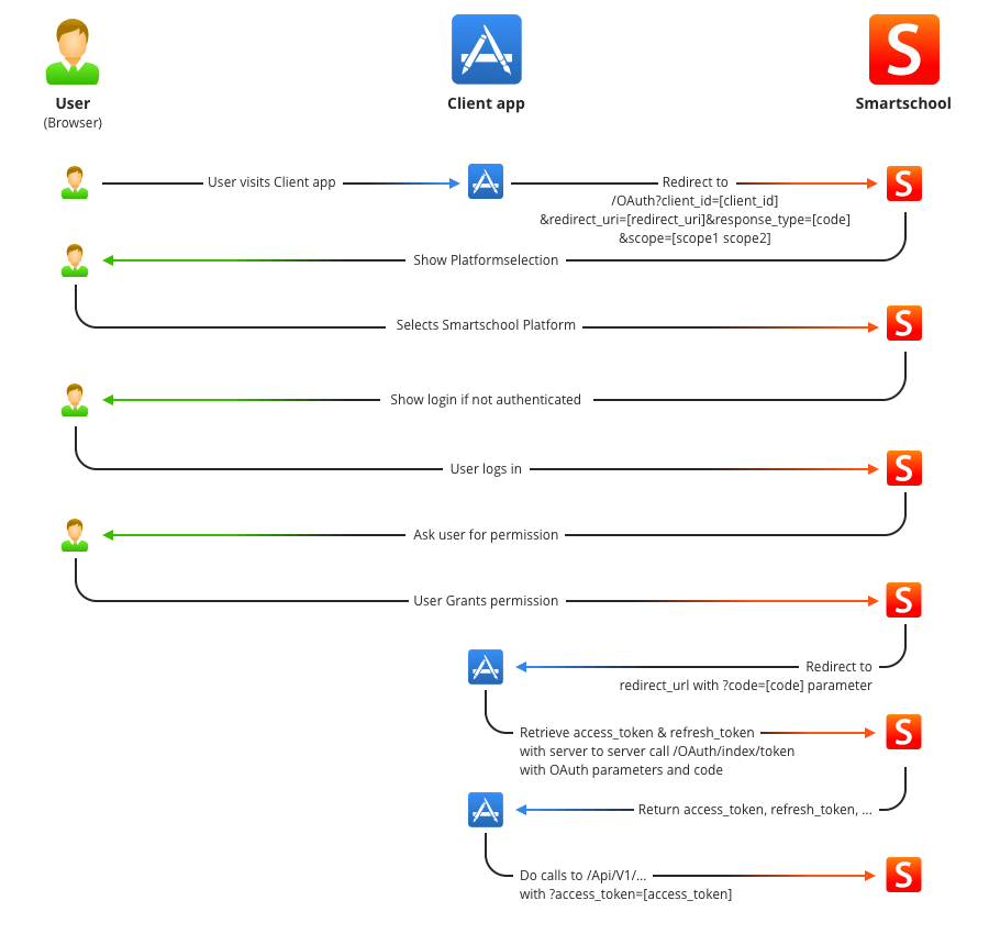 Smartschool ondersteunt OAuth2 als Identity provider. Hierdoor wordt het mogelijk een koppeling te leggen met een Smartschoolgebruiker. Eenmaal deze koppeling er is kunnen gegevens uitgewisseld en acties uitgevoerd worden voor deze Smartschoolgebruiker.